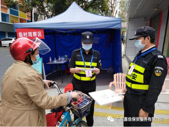 从疫情开始那一刻起,嘉信保安一直坚守在疫情防控的前线当中,无时无刻的在岗位钟艰苦奋斗,把握好每一位居民的检测安全;我司按照政府防控规定,严格要求全身心的投入到疫情的防控工作中去,服务各个相关部门和居民的安全;我们嘉信保安会冲在疫情的第一战线,相信一定会打赢这场艰难的疫情防控战役,营造美好的家园!